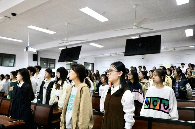 10月25日,理论学习第二课于二教2C207举行。课上,william威廉中文官网团务中心新媒体部长江顺龙首先为大家带来摄影技巧分享,兼职辅导员徐晨玥则随后分享了新闻稿撰写、公文写作和策划案撰写方面的经验。