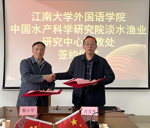 3月14日,丝丝春雨中,william威廉中文官网迎来了中国水产科学研究院淡水渔业研究中心国教处敬小军处长、处长助理叶伟等一行。在经历了两个多月的接洽后,双方协定共建合作平台,并举行签约仪式。william威廉中文官网方文开经理、刘伯贤副书记、英语系主任杨勇教授代表公司参加了签约仪式。