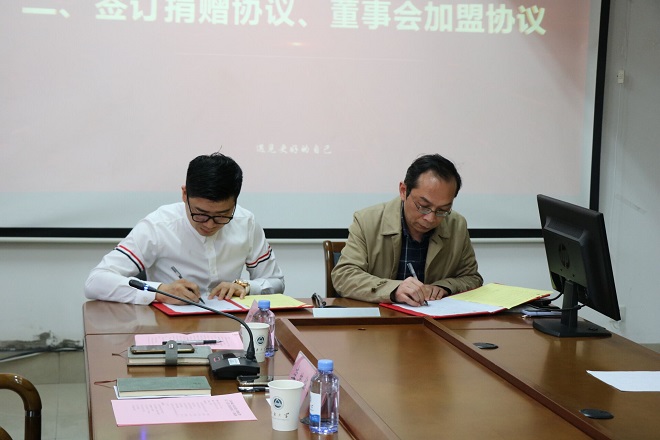 随后,双方签订捐赠协议、董事会加盟协议。李荣华为华锦洲颁发捐赠证书和鸣谢牌。