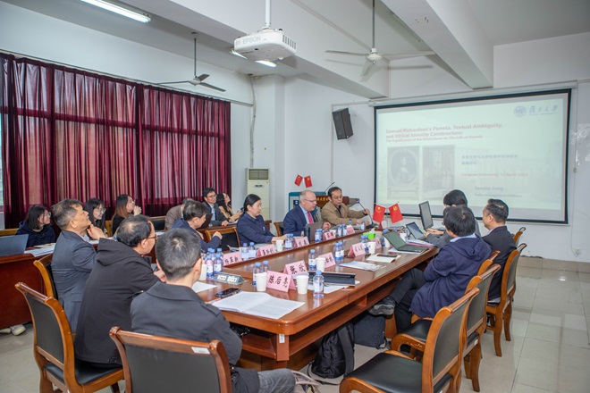 上午的论坛共有7位专家做主旨报告。聂珍钊教授做了题为“科学选择与人工智能文学”的演讲,他指出文学伦理学批评中的科学选择阶段就是AI阶段,AIGC将成为文学创作的主要工具,将导致一种全新的用于解释AI文学的科学理论的出现,并详述了AI文学的作者是谁、AIGC多模态文学的类型和意义等问题。苏晖教授围绕“关于人工智能文学的伦理思考”展开讨论,她从创作主体角度区分了人写机器和机器写人这两种写作,并剖析了科幻文学中的机器人伦理与人机伦理关系、人工智能写作与人类创作的伦理差异等等。Sandro Jung教授的报告分析了C·怀特菲尔德的绘画作品《帕梅拉的一生》作为副文本对小说《帕梅拉》的补充与对于人物伦理身份建构的影响。尚必武教授根据AI文学的兴起对叙事学构成的挑战,简述了人工智能与世界文学之间的四重关系,并提出探索更多未知、实现范式转换和拥抱AI文学的期许。王松林教授以微软小冰写诗为例,引入未来的人工智能是否能够具有自己的情感体验和审美情感这一问题,并透过赛博格、人工生命等概念讨论了人工智能的主体性和人工智能文学的审美伦理问题。罗良功教授以“中国新时代美国诗歌的伦理批评”为题,展现美国诗歌伦理批评的艺术维度,强调诗歌文本的艺术形式对于伦理意义建构与表达的重要功能。杨革新教授的报告指出,从“作者已死”到AI写诗的过程并不意味着文学的终结,而是文学表达和理论的演变,应该积极拥抱跨学科方法,实现文学的科学化和创新。