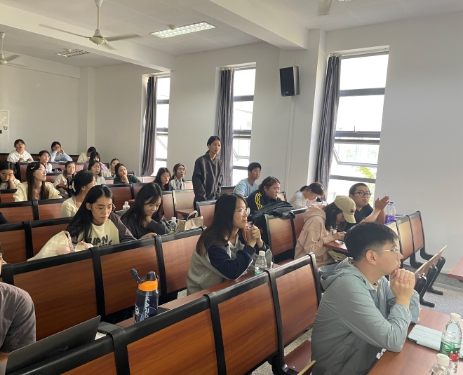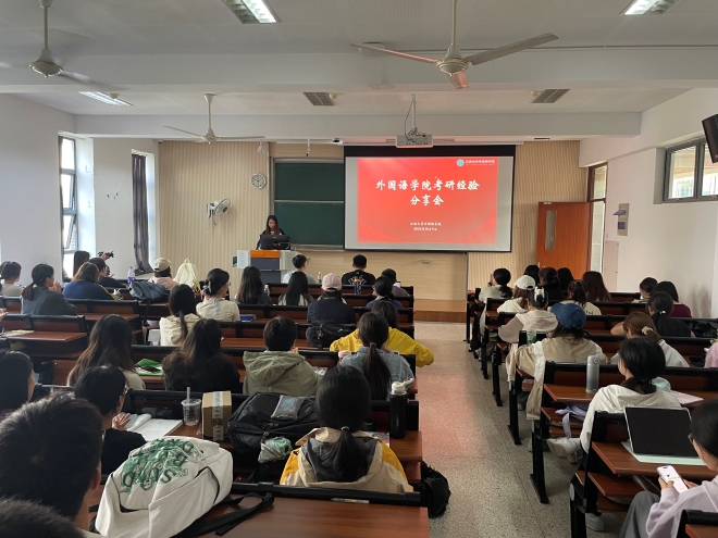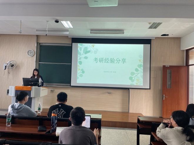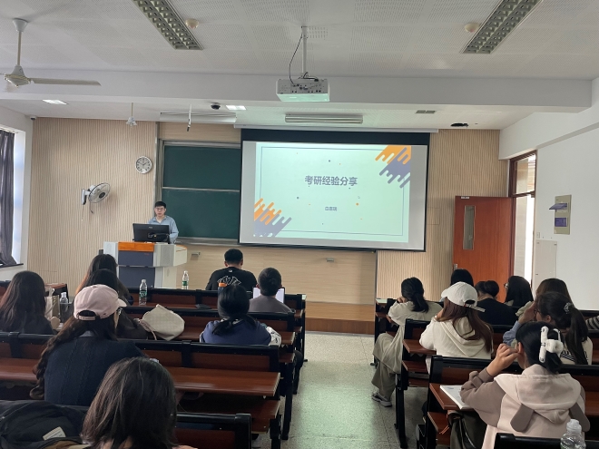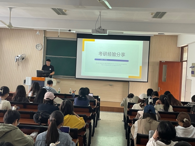 刘欣民学长在进行了简洁的自我介绍后,着重从心态方面讲解备考秘籍。他同样提到,备考时需要专注自身学习,关注自身的进步而非网络上关于考研复习的炒作。他指出英语专业在学习时的特点是积少成多,稳定的心态更能帮助我们完成质变。此外,他细致介绍了如何确定考研目标,并推荐了复习资料和工具,为同学们考入理想的公司提供指引。