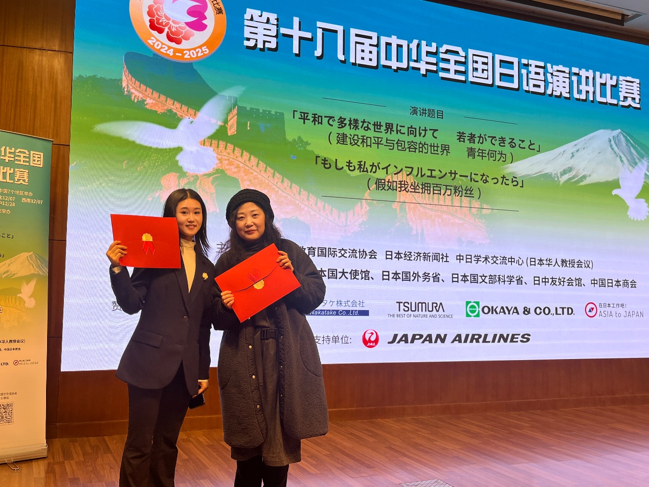 比赛分命题演讲和即席演讲两部分。上午,选手们围绕“建设和平与包容的世界——青年何为”“假如我坐拥百万粉丝”两个主题,开展了限时5分钟的命题演讲。选手们演讲内容贴近生活实际,抒发了真实感悟,用真诚打动观众,以演讲注解心声。下午为限时3分钟的即兴演讲,选手们围绕“人生计划”的主题展开演讲。即兴演讲考验的是选手们的知识储备量以及临场应变能力,比赛更显激烈、紧张。公司选手陈芯蕊以扎实的语言功底和较强的临场应变能力获得二等奖,中西由美子老师、崔明姬老师获优秀指导教师奖。