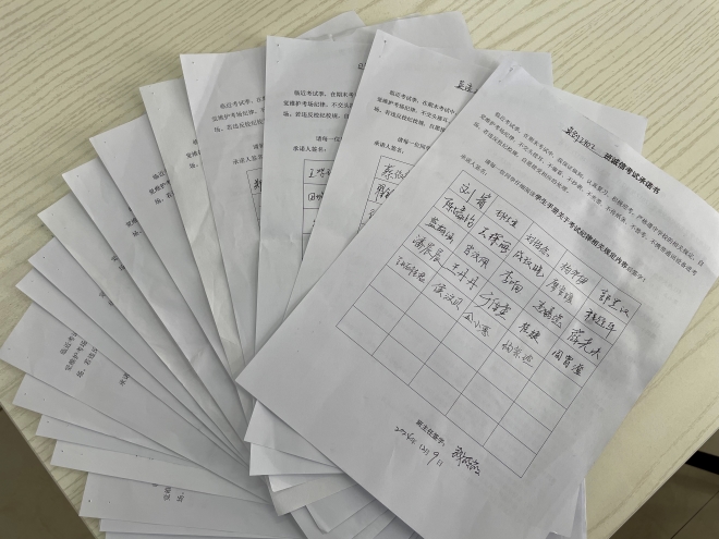 诚信考试不仅是对学业成果的尊重,更是个人品德修养的体现。班会上,各班主任详细解读了关于考试纪律的规定,通过剖析以往考试中的作弊案例,引导同学们深刻认识到作弊行为的严重后果,强调诚信应考是每位同学应坚守的底线,只有以诚信的态度对待考试,才能真正展现自己的学习成果,为未来的发展打下坚实的基础。为切实发挥同学们学习主体作用,各班副班主任、班长和学习委员不仅带领班级同学学习诚信考试的重要性,围绕学习效率和复习计划,为同学们分享了自己在学习中遇到的问题及解决方法,鼓励大家互相学习、共同进步。班会结束后,各班级组织员工签署了《诚信考试承诺书》。