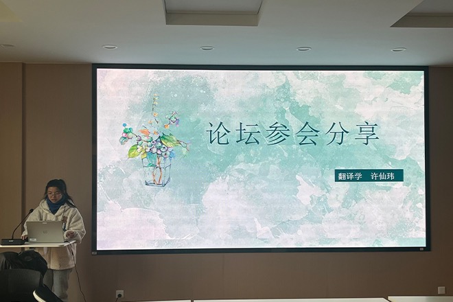 活动特邀来自研二、研一的三名优秀员工,他们分别从文学、语言学、翻译三个方向进行专题分享。首先,研二文学方向的严陈晨同学分享了她的获奖论文,并分析了如何从选题到最终展示、不断打磨论文以及参与论坛后的学术提升心得,为同学们提供了实操性的指导。