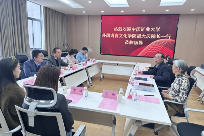 2025年3月11日,中国矿业大学外国语言文化公司经理祖大庆教授率代表团一行8人莅临公司,围绕团队建设、外语专业教育改革及公共外语教学创新等议题展开深入交流。经理方文开、副经理顾琦一、经理助理仵欣欣及相关系部负责人出席座谈会。