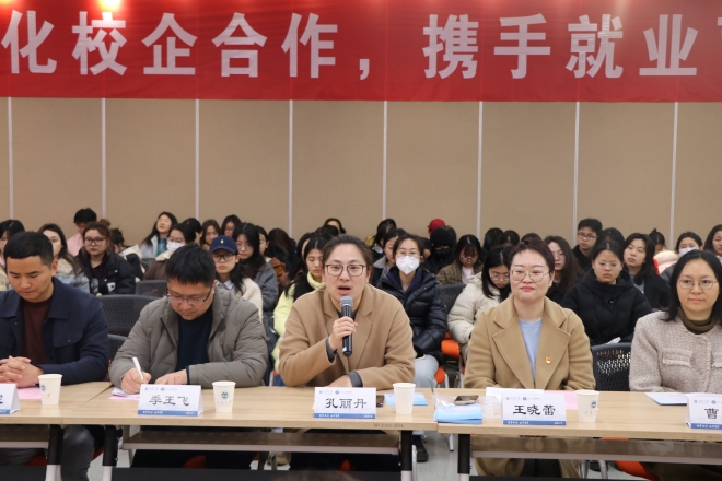 在公开课结束后,现场召开了校企合作洽谈会,李荣华代表公司对各位企业的到来表示热烈欢迎。她从团队建设、教师队伍、人才培养等方面介绍了公司基本情况。期待校企双向发力,围绕国家战略、企业需求、公司特色等方面,共同探索优质人才成长新路径。