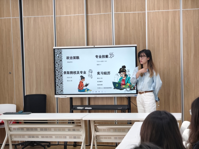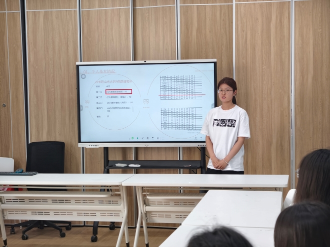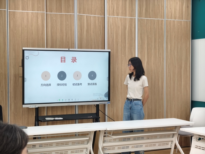 首先,考上北京师范大学的刘舒宁从“方向选择”、“择校经验”、“初试备考”以及“复试准备”四个方面进行分享。在院校选择方面,她建议同学们避免扎堆盲目跟风,要结合专业匹配、自身实力、未来发展等因素综合考量,她鼓励同学们积极参专业类竞赛,从竞赛中学习成长;接着,考上山东大学的辛佳琪重点分享了考研过程中的复习计划与心态调节。她说:考研是一场持久战,一定要制定适合的自己的复习计划,然后按照计稳步进行。她提到备考时需要专注自身学习,避免网络虚假信息引发情绪波动,越到最后,稳定的心态越重要,劳逸结合可以提高学习效率。最后,她推荐了复习资料和工具,为同学们考入理想的公司提供指引;最后,考上同济大学的张怡琳进行分享,她结合自身经历,围绕院校专业选择、复习计划制定、复试能力提升等问题展开细致讲解。她提出考研备考全过程都应按个人节奏制定计划,避免盲目攀比,合理分配时间,兼顾学习与放松,坚定目标。
