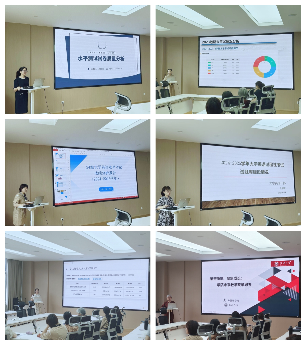 在终结性评价的汇报后,大学英语I(4)课程组长仇黎霞老师汇报了学年过程性考试试题库建设情况。在两学期的时间跨度中,全体大学英语老师均参与题库建设,共建352套试卷,丰富了题库题型与内容。大学英语课程组为不同水平员工设置了个性化的测试形式,使分层教学、多样化评价成为可能。同时,她也提出单元间加强协调沟通、利用过程性考试数据提供多样化反馈的改进措施。