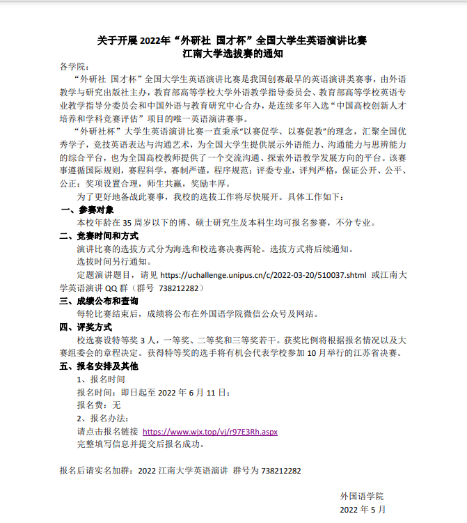 关于开展2022年“外研社 国才杯”全国老员工英语演讲比赛william威廉中文官网选拔赛的通知