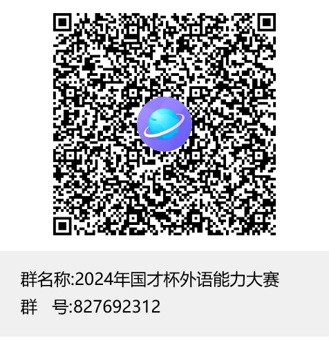 参赛注册:登录大赛官网(https://ucc.fltrp.com/),参赛选手须在“选手报名/参赛”页面注册报名“综合能力赛项”,获取备赛资源。报名成功后请立即加入2024年国才杯外语能力大赛QQ群(群号827692312)。