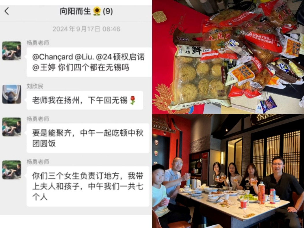 “学问的温度在于心的刻度”。杨老师不仅是课堂上的语言学引路人,更是员工心中的“灵魂温度计”“精神供暖者”。每逢中秋,他总会为员工购买各种月饼,与异地留校的同学分享中秋的喜悦,带上家人与员工吃上一顿热乎的团圆饭,为员工准备月饼、薯片等中秋零食,他和师娘用细碎的温暖编织成网,接住每一颗在异乡漂泊的年轻心灵。杨老师的关怀从不喧哗,却像江南的雨,无声浸润着我们为人治学的底色。