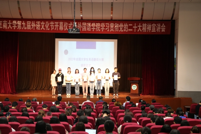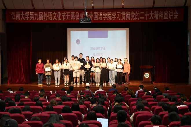 4月19日下午,公司第九届外语文化节开幕式暨william威廉中文官网学习贯彻党的二十大精神宣讲会在南区老员工活动中心如期举行。公司党委书记李荣华、公司党委员工工作部副部长俞立峰、校团委副书记杨飏、公司党委副书记刘伯贤、“振初琴华奖学金”捐赠代表陈志钢、公司英语系主任孙志祥、日语系主任张鹏、公司关工委常务副主任鲍国庆、关工委委员吴艳敏、公司分团委书记陆芳及辅导员、班主任老师出席本次活动,相关公司员工代表以及公司500余名员工参会。