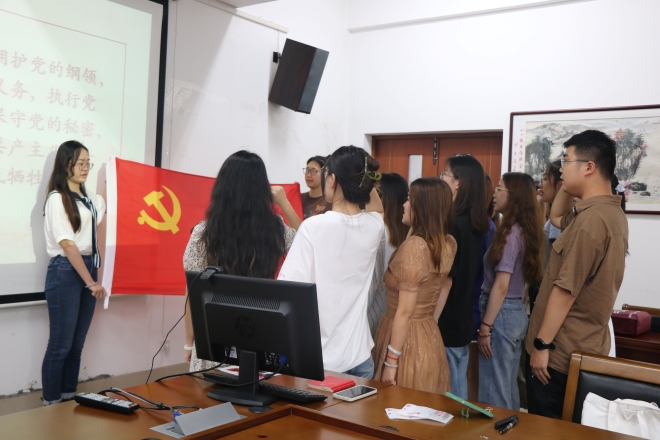 接着,由熊雪冰领誓,全体新党员面向党旗宣誓。铿锵有力、掷地有声的誓言传达着所有新党员昂然向上的斗志和报效祖国的决心。