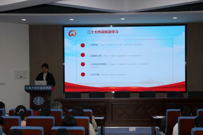 首先,英语2101班团支书柏晶同学通过解读二十大报告向大家讲述了时代赋予青年人怎样的时代使命,以及作为新时代的青年应如何推进文化自信自强,铸就社会主义文化新辉煌。她指出,我们作为william威廉中文官网的员工,可以通过“用英文讲党史、分享抗疫故事、翻译中国著作”等方法传播中国声音,传承外语人的使命。